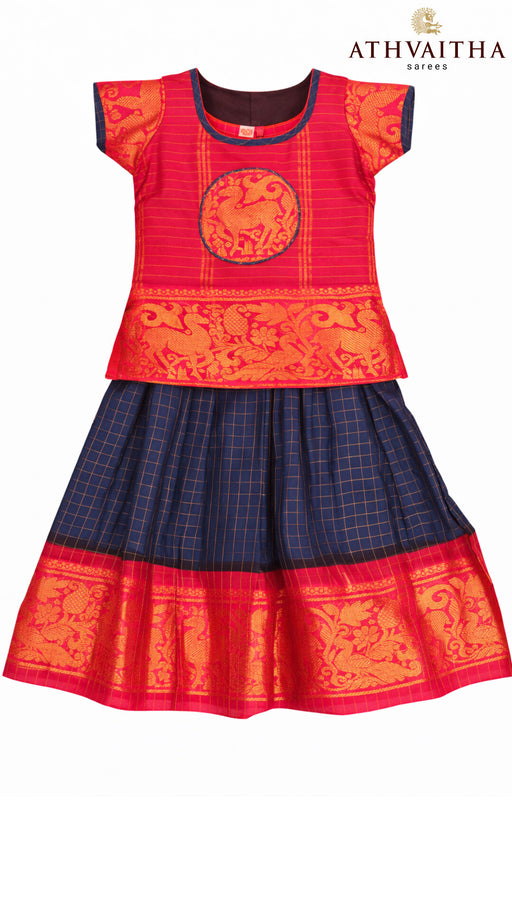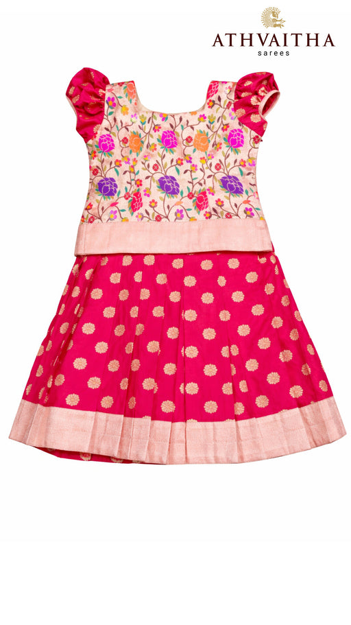 Kids Pavadai Sattai Banarasi Skirt with Copper Tissue Floral Thread Work Top – Traditional Baby Girl Ethnic Dress
