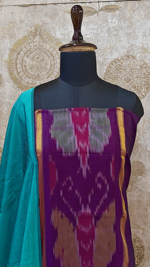 Ikkat Sico Silk Cotton Salwar Material - Purple With RamaGreen