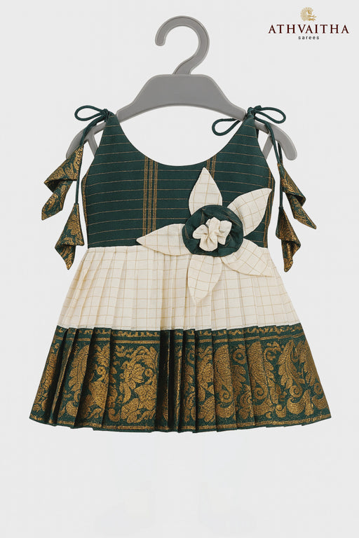 Design: Nakshatra Color: Dark Green & Cream Checked with Gold Zari Design Brand: Athvaitha Fabric: Rani Sungudi Cotton Type: Kids Maxi Gown C...