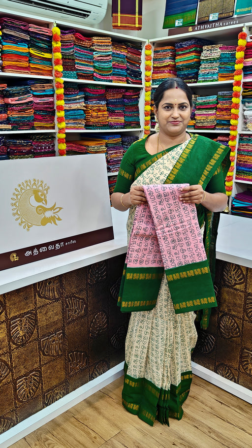 View full detailsRani Sungudi Cotton Sarees With Tamil Letters & Double side Peacock Border-Contrast