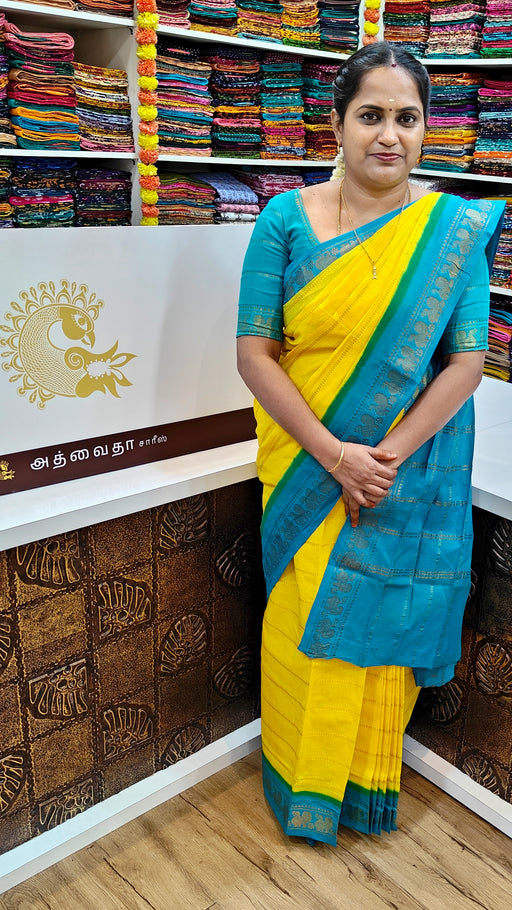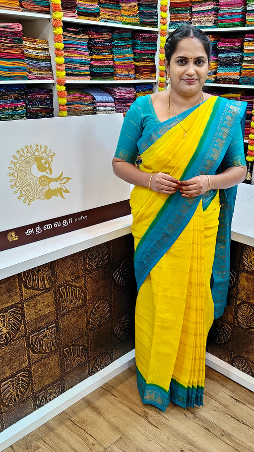 View full detailsRani Sungudi Cotton Saree With Doubleside Contrast Border Veldhari -Yellow-SkyBlue